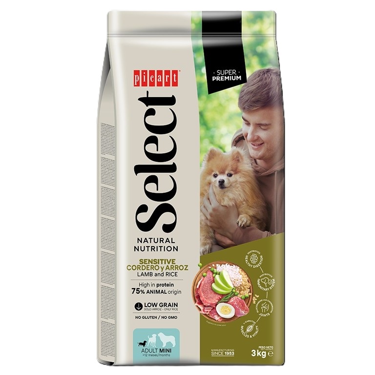 סלקט מיני בוגר על בסיס כבש ואורז של חברת ®Picart הספרדית הוא אוכל לכלבים בעל נוסחה חדשה המותאמת באופן מיטבי לצרכים אלה. הכבש כמרכיב בשרי ראשון ויחיד מעניק חלבונים איכותיים עם טעימות יוצאת דופן.