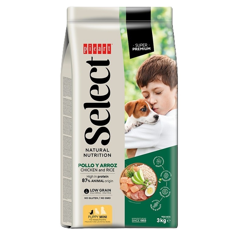 אוכל לכלבים "סלקט מיני" של חברת ®Picart הספרדית מותאם בצורה מיטבית לצרכיהם של כלבים מגזע קטן, ומאופיין בערך תזונתי גבוה וויטמינים ומינרלים המסייעים בשמירה על השיניים, הלב, המפרקים, העור והפרווה. המרכיבים הייחודיים תורמים לשמירה על מצבם הפיזי והחיוניות של כלבים מגזע קטן.